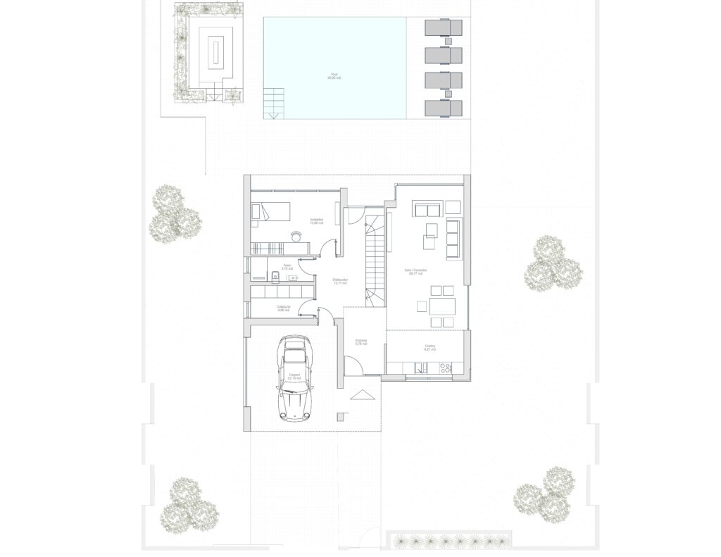 Die Villa bietet ein zeitgemäßes Design auf zwei Ebenen mit einer einzigartigen und attraktiven Fassade. Sie verfügt über einen offenen Grundriss und ein beeindruckendes Wohnzimmer mit doppelter Raumhöhe sowie direktem Zugang zur Poolterrasse.